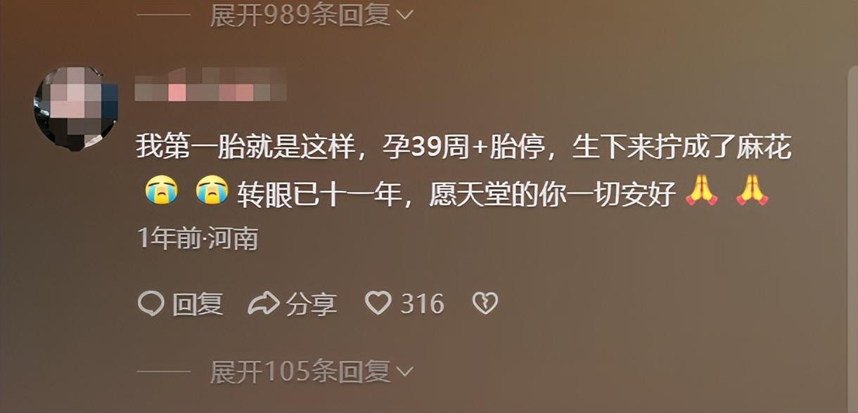 還有另外一個媽媽更悽慘,第1胎就是懷孕39周的時候胎停,生下來的時候孩子的臍帶已經扭成了麻花,現在已經過去11年了,媽媽還永遠記得那個樣子,內心感覺非常的愧疚。