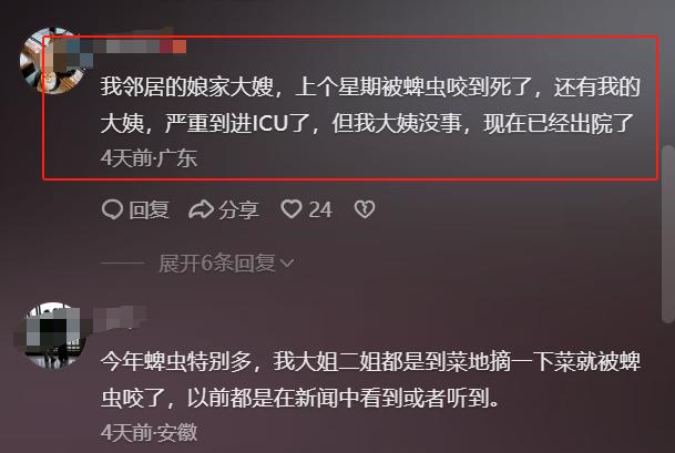 還有網友說自己鄰居的孃家大嫂上個星期被蜱蟲咬死了,而自己的大姨被蜱蟲咬了之後進ICU,現在大姨沒事已經出院了。