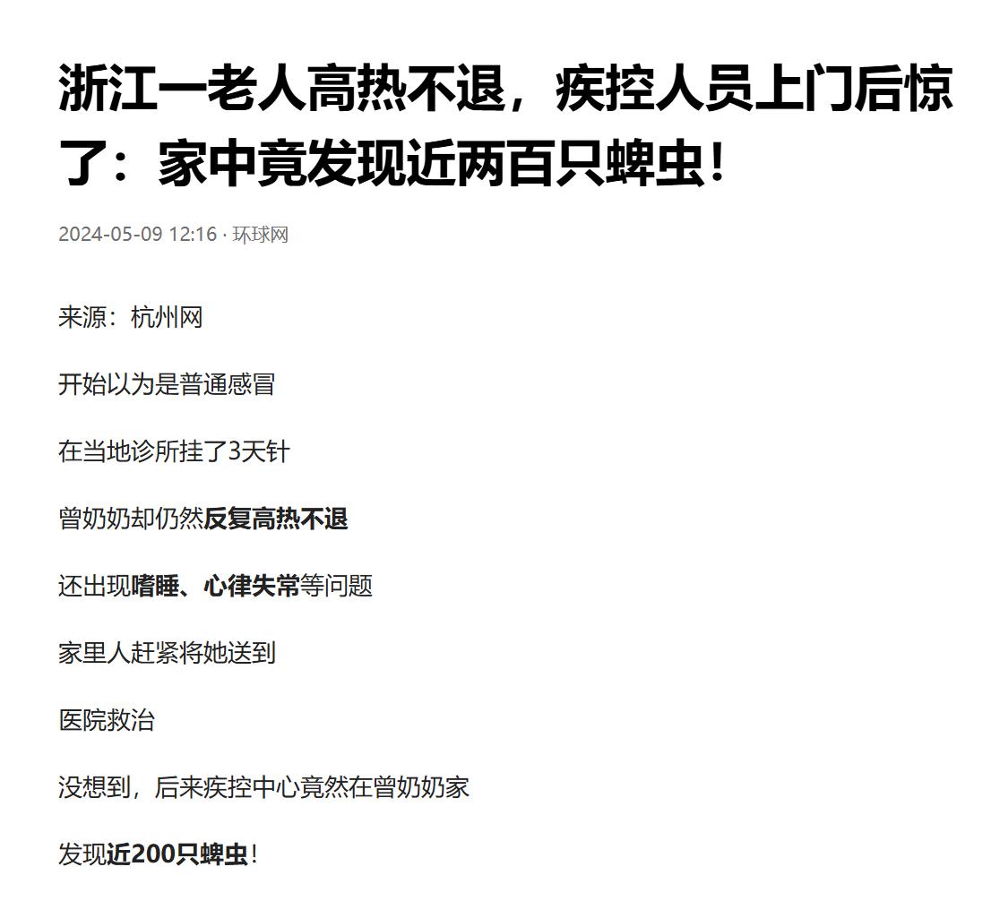 今年浙江一個老人高燒不退,後來疾控中心的人上門發現家裏面至少有200只蜱蟲。