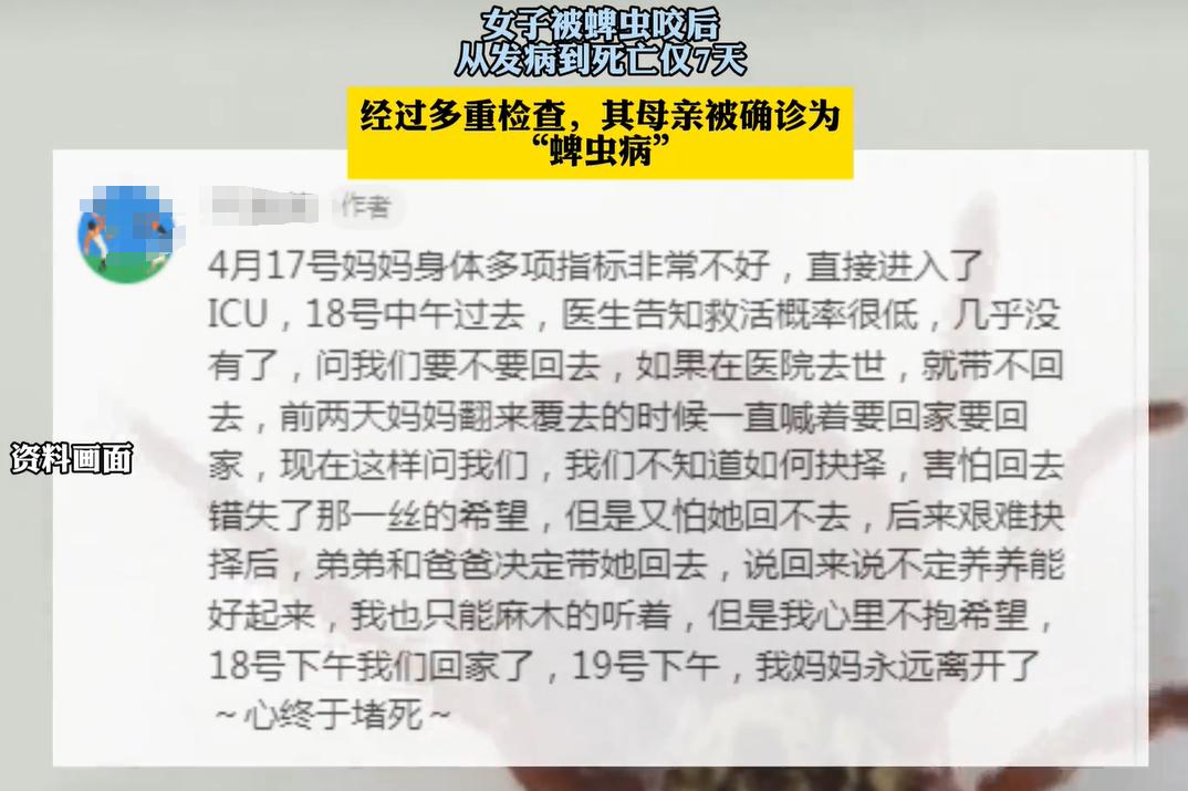 一個江蘇的網友提到自己的媽媽被蜱蟲咬到,發病去世僅僅是一個星期,剛開始媽媽說沒有食慾,身體感覺有點冷,後來抽血的時候發現血小板和白細胞低,懷疑是白血病,後來檢查發現是蜱蟲病,送到ICU沒幾天就永遠離開了。