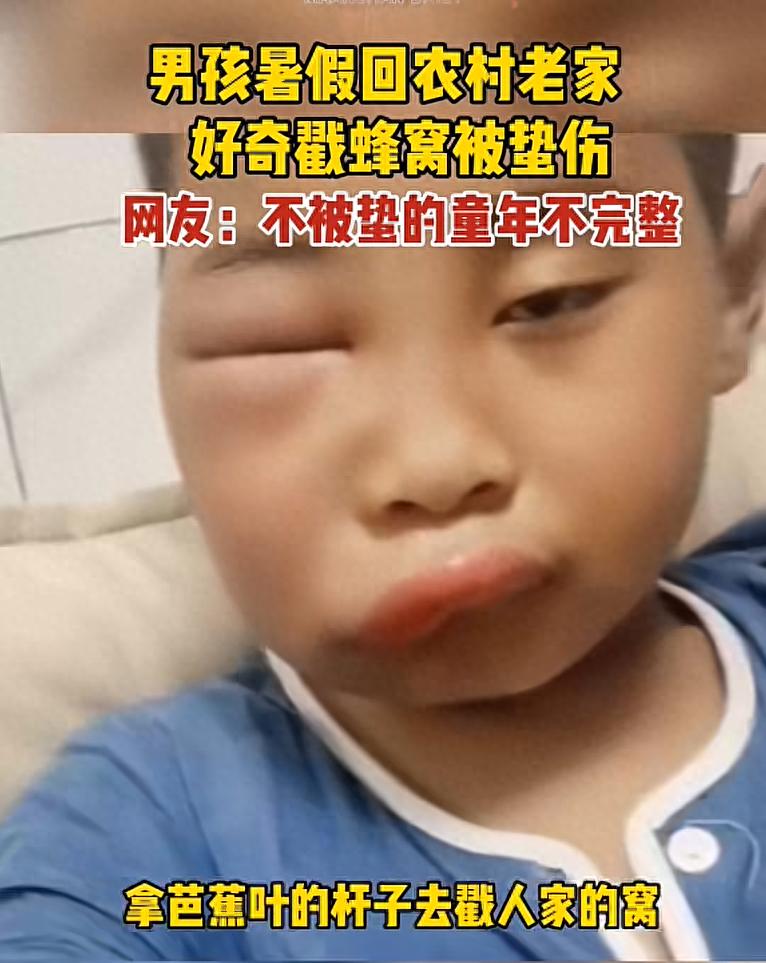 這下可慘了,蜜蜂從自己的蜂巢裏面飛出來追着這個小男孩,好幾只蜜蜂追着小男孩蟄,沒一會兒他的右臉就腫了起來,腫得眼睛都睜不開了,臉上的肉都垂下來了,簡直就是毀容了,看到臉上的樣子媽媽是又氣又笑,真的是沒啥事幹了,去捅蜜蜂窩!