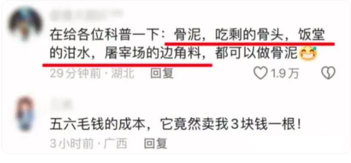 究其原因,據網友爆料,骨泥的來源是喫剩的骨頭、飯堂的泔水和屠宰場的邊角料混合加工而成。