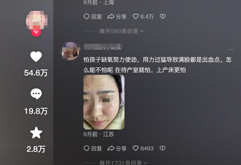 還有一個媽媽曬自己生完之後臉上的相片,密密麻麻的都是出血點,因爲怕孩子缺氧,就非常努力的用力,用力過猛導致全臉都是出血點。
