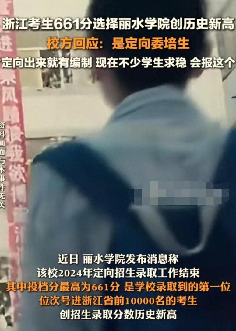 這讓我想起浙江麗水學院招收了一名661分的高考生,要知道麗水學院就是一個普通的二本院校,爲什麼能招到這麼高分的學生呢?主要是因爲他們是屬於定向委培生,也就是去上大學的時候有補助,甚至學費都不用,而且出來馬上就有工作。