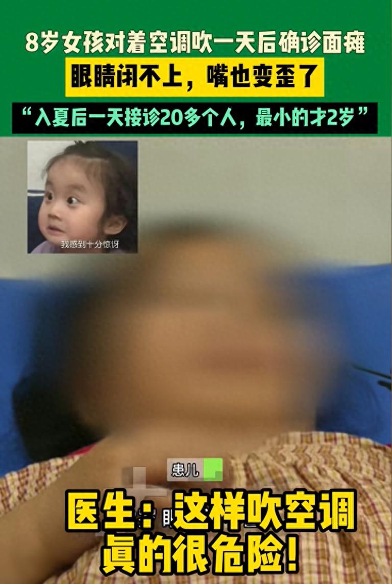 一個8歲的小女孩對着空調吹了一天之後,去醫院醫生確診是面癱,眼睛閉不上了,嘴也變歪了,醫生說入夏之後一天會接診20多個人面癱,有一些小的才兩歲,這些都跟吹空調有關係。