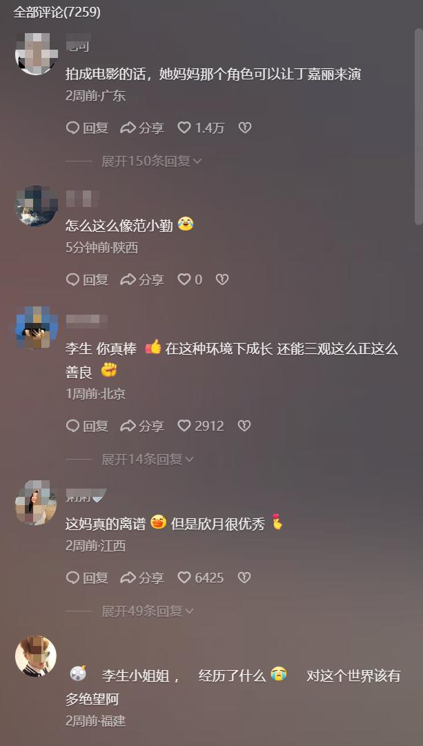 網友說:媽媽真的是太離譜了,但是女生很優秀。更有網友說:能感受到內心的哽咽崩潰。有網友說:電影都不敢這麼演。