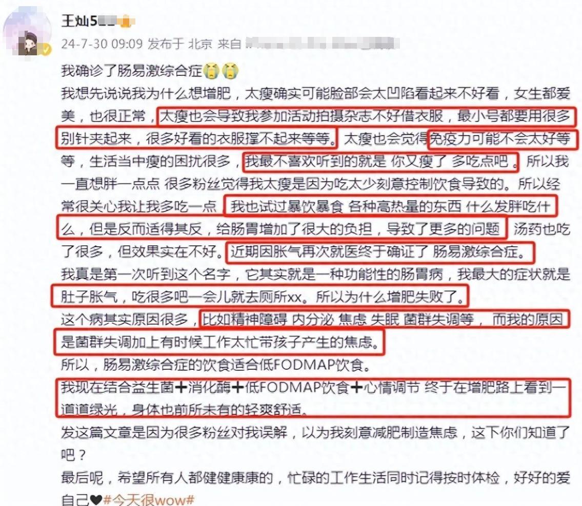 王燦最近卻曬出了自己去醫院檢查的報告,說自己確實是比較瘦,有時候去拍一些廣告,小碼的衣服都穿不上,還要用夾子來夾上,其實特別的不方便,而自己也覺得太瘦的話,整個臉上都是沒有肉的,看起來不好看,所以她也不喜歡自己太瘦。