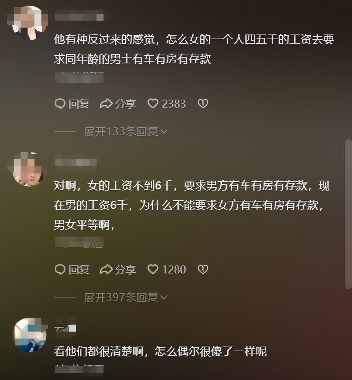 但也有很多網友說:爲什麼女的一個月拿幾千塊錢,就要求男的有房有車有存款,還要有事業,男的就不能要求女的嗎?