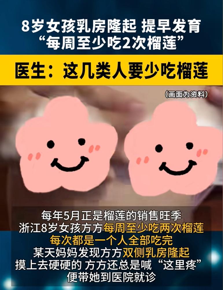 同樣是浙江有個8歲的女孩子,每週至少要喫兩次的榴蓮,結果出現了乳房隆起提早發育,後來醫生說跟榴蓮也有一定的關係。因爲榴蓮熱量和糖分都比較高,喫多了容易導致營養過剩肥胖,一旦肥胖容易導致發育提前!
