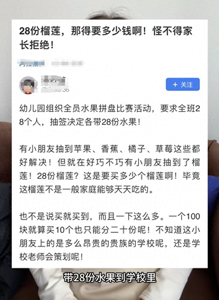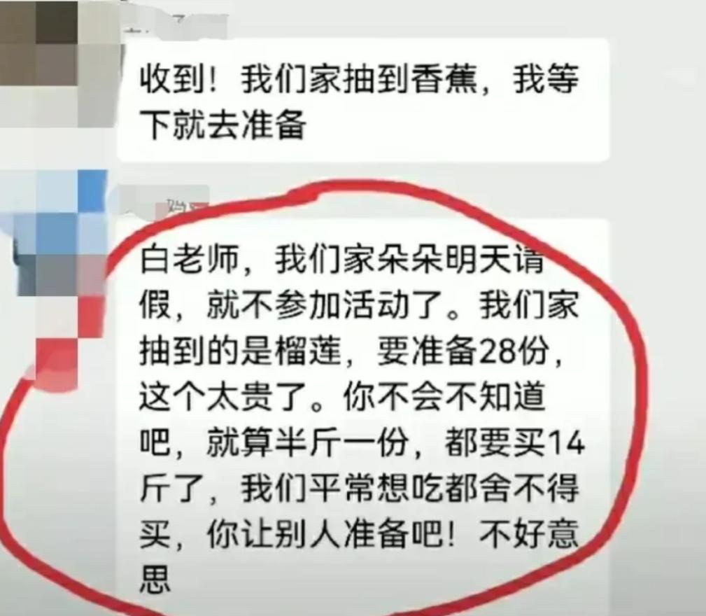 所以家長就跟老師說,我們家朵朵明天就請假不參加活動了,主要是榴蓮太貴了,我們平時喫也不捨得買,不好意思,你讓別人準備吧。