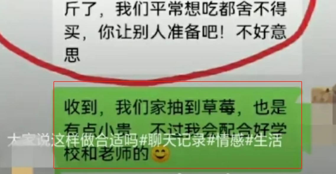 但其實老師搞一個集體的活動不容易,很多家長都會想着要配合老師,於是下面就有一個家長說:我們家抽到的是草莓,也是有點小貴,但是我會配合好學校和老師的。