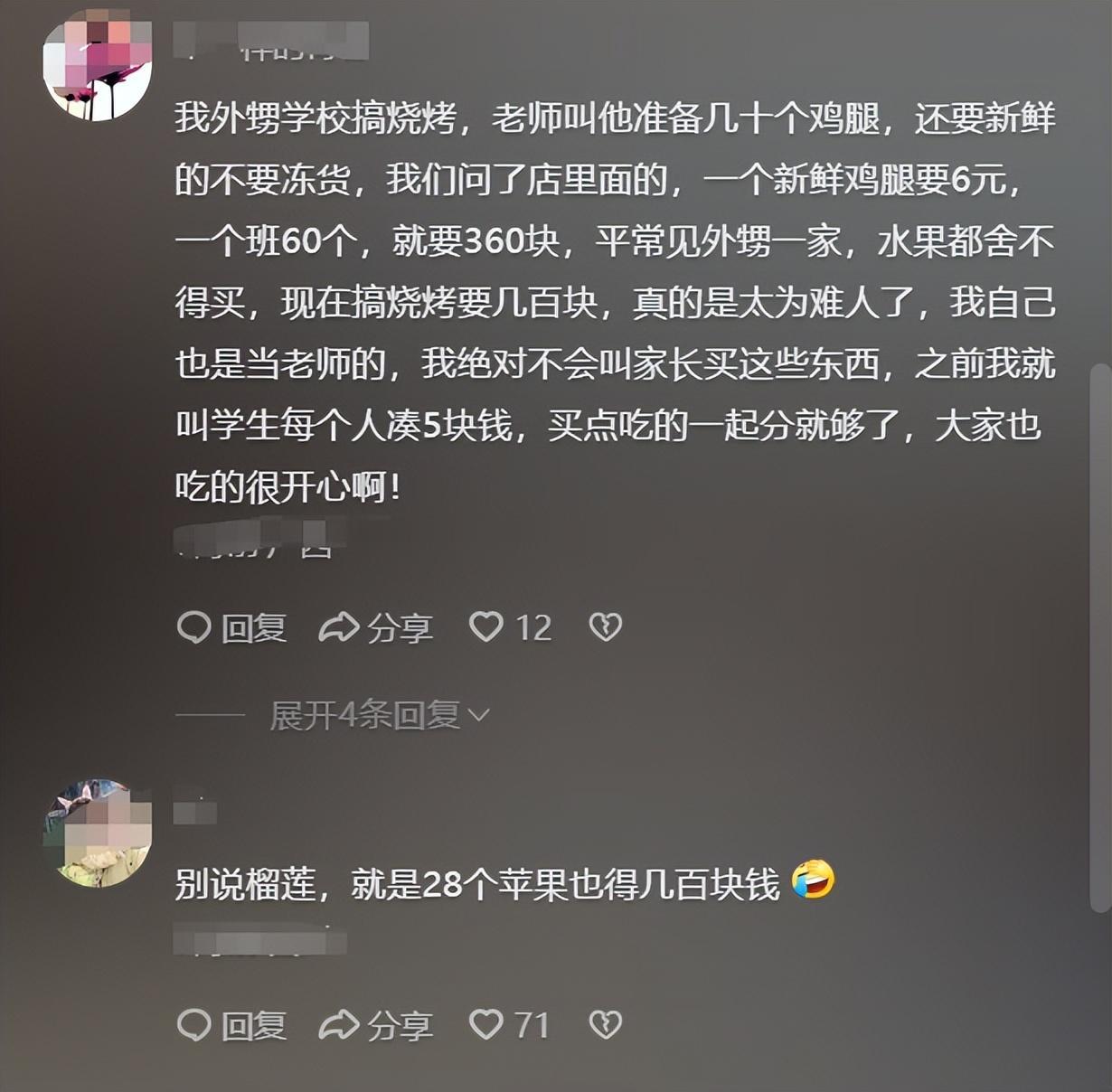 網友說自己的外甥幼兒園裏面搞燒烤,老師要求要準備雞腿,而且要新鮮的,不要冷凍的,然後家長去店裏面問了一個新鮮的雞腿要6塊錢,一個班要60個,那就是360塊錢,而外甥家的條件不是很好,平時水果都不太捨得喫,實在是太爲難人了。