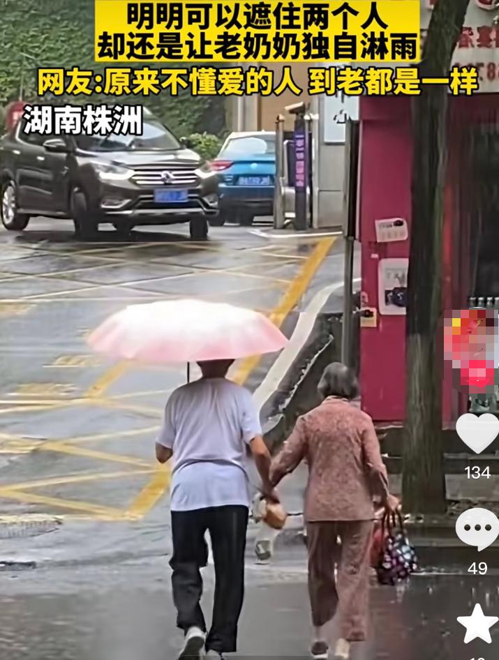 這個傘明明都可以遮住兩個人,但是老頭子偏偏要一個人打就行了,壓根沒有給老太太擋一點點雨,這說明這個老頭子在年輕的時候也是一個不懂愛的人,到老了也是一樣,但這個阿姨偏偏忍受了一輩子。