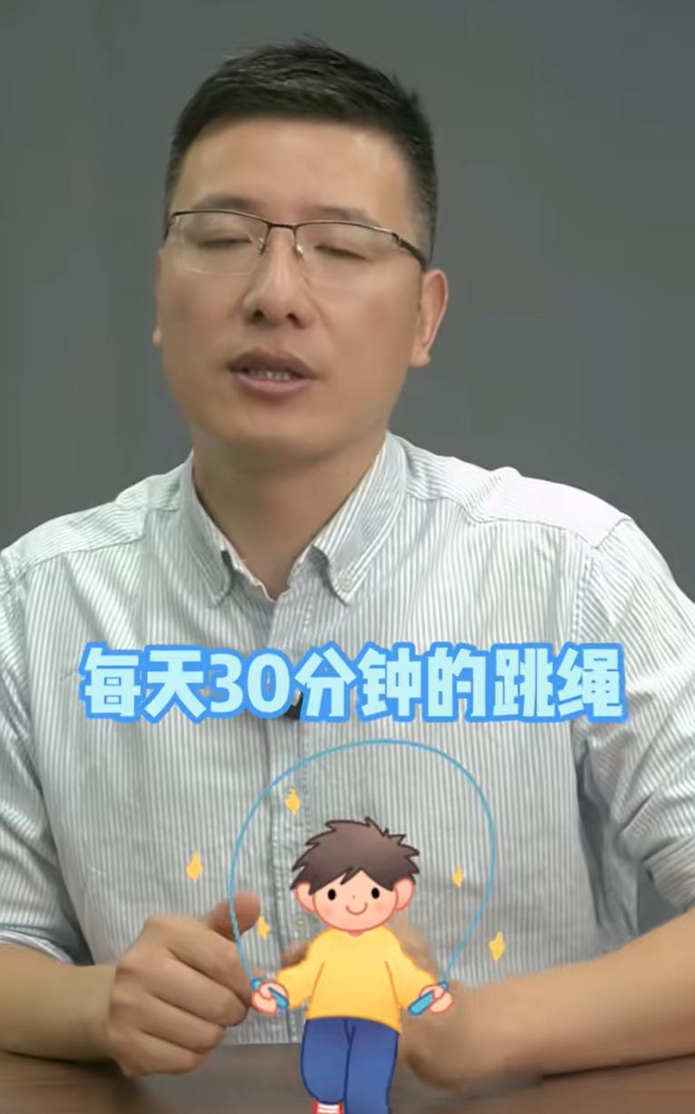 一個就是每天堅持30分鐘的跳繩,而且跳繩的時候最好是在戶外跳,因爲戶外的時候太陽照在孩子的皮膚上可以產生維生素D,而且跳繩是一種高強度、間歇性的有氧運動,對孩子的生長板有刺激的作用,在跳的時候不求孩子跳得多快,儘量讓孩子的腳稍微抬得高一點點,比如說雙腳輪換着跳,這樣子能夠更好地刺激孩子的骨骼。