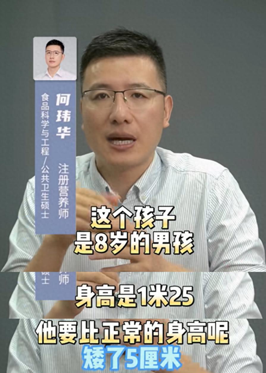 營養師何瑋華說起他的一個經典案例,一個男孩在8歲的時候只有1米25,在同齡孩子中屬於中等偏下的身高,也就是孩子的身高要比同齡平均身高矮個5釐米。