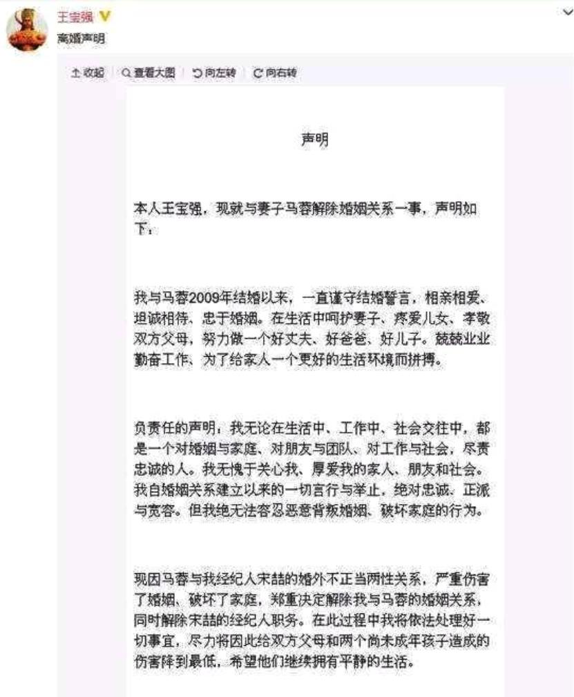 這個世界上沒有不透風的牆,後來被王寶強發現了,王寶強當然不能容忍,在2016年8月14日直接在網上發出自己的離婚聲明,甚至自曝家醜,提出自己的妻子在婚內跟經紀人發生不正當的關係。