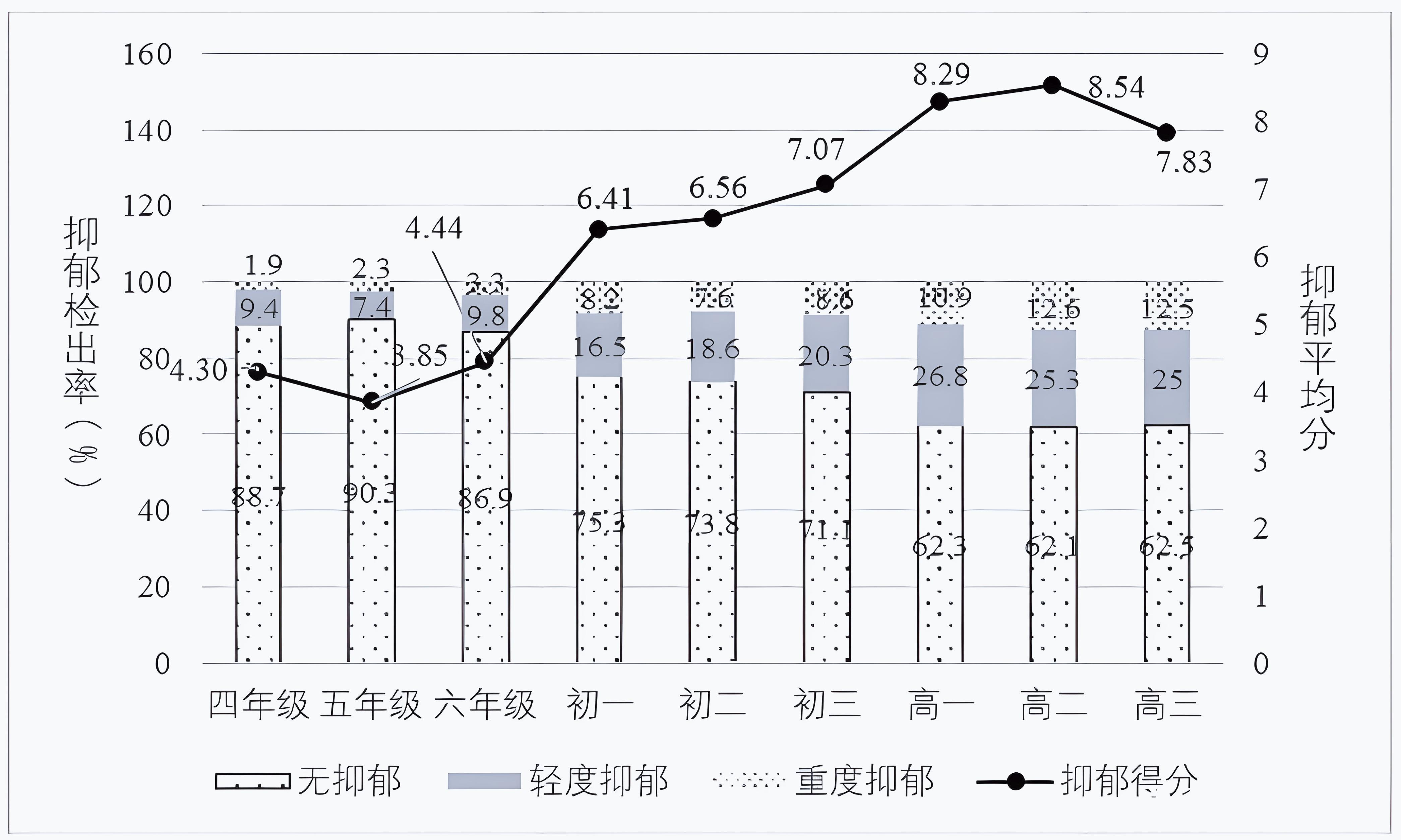 初中階段的抑鬱檢出率約爲30%左右,重度抑鬱的檢出率爲7.6%—8.6%;