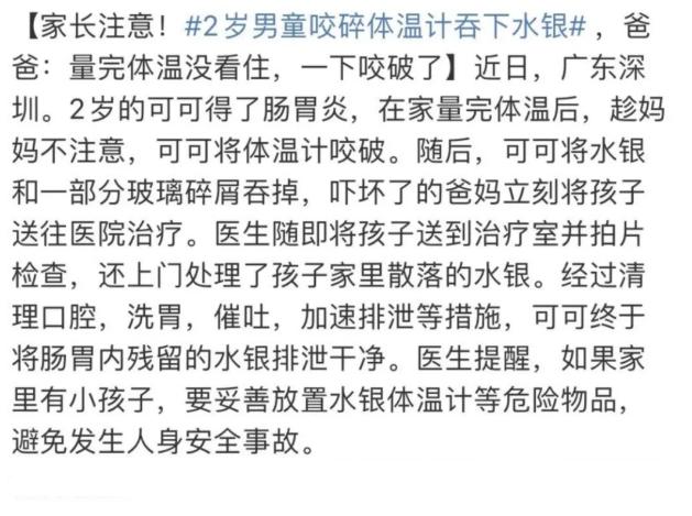 無獨有偶,來自深圳的可可,因爲腸胃炎發燒了。媽媽在家給他量完體溫後,一個不注意,2歲的可可就咬破了水銀體溫計,還將部分水銀跟玻璃碎渣給吞了下去。