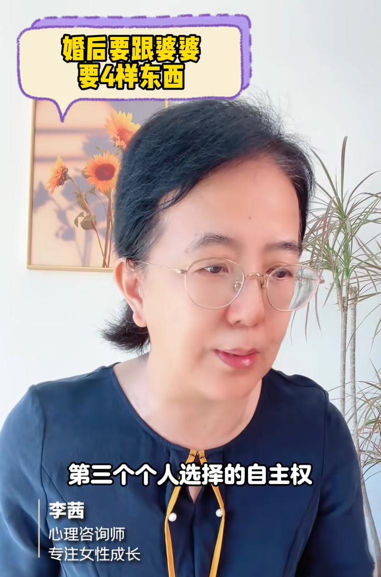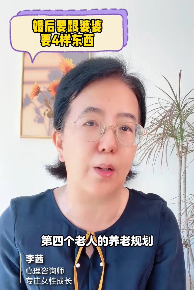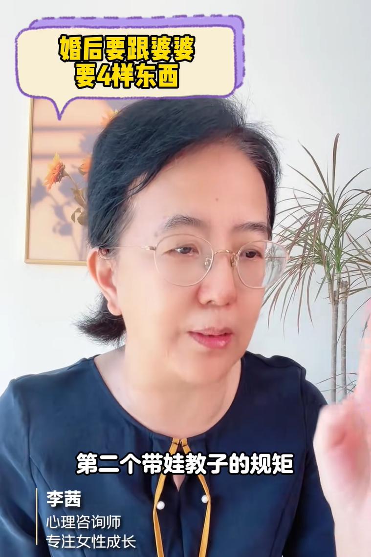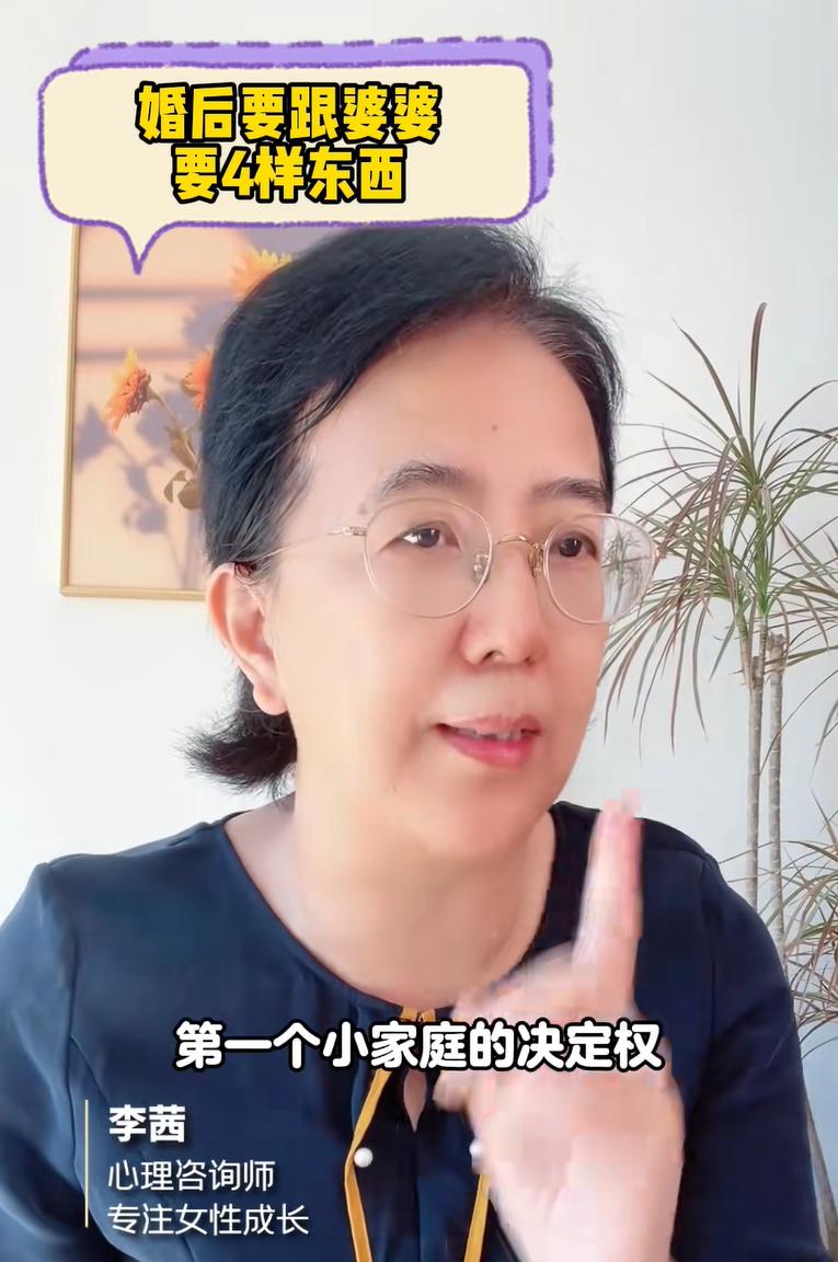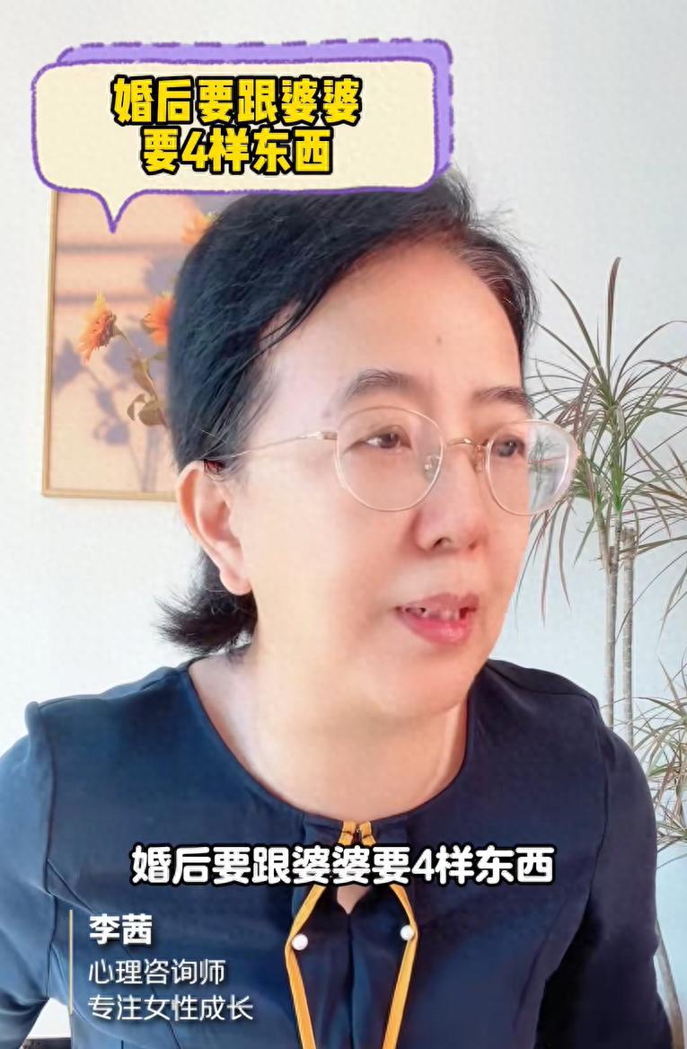 李茜老師就建議:女性在結婚後要跟婆婆要四樣東西,在剛結婚的時候這四樣東西就拿到手,就能避免婚後婆媳出現衝突,而作爲婆媳關係之間的粘合劑和中間人老公也不爲難,作爲婆媳關係出問題最容易受傷的孩子也能夠健康的成長。