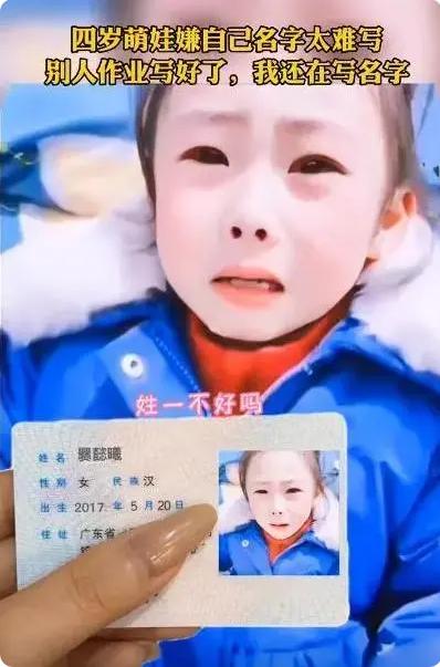 像這個4歲的萌娃,就在視頻中哭訴自己的名字太難寫,別人作業都寫完了,她還在寫名字。於是對父母發出靈魂拷問:姓一不好嗎?姓二不好嗎?爲什麼要姓爨?