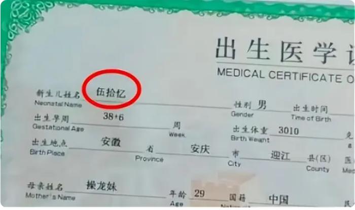 董事長雖然厲害,但沒有真金白銀實在,於是這對父母給兒子取名“伍拾億”,已實現自己內心那個不能言說的“暴富夢”。