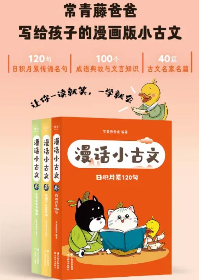 《漫話小古文》共有3本,即《日積月累120句》、《成語可以這樣學》、《小學生必背名篇》。