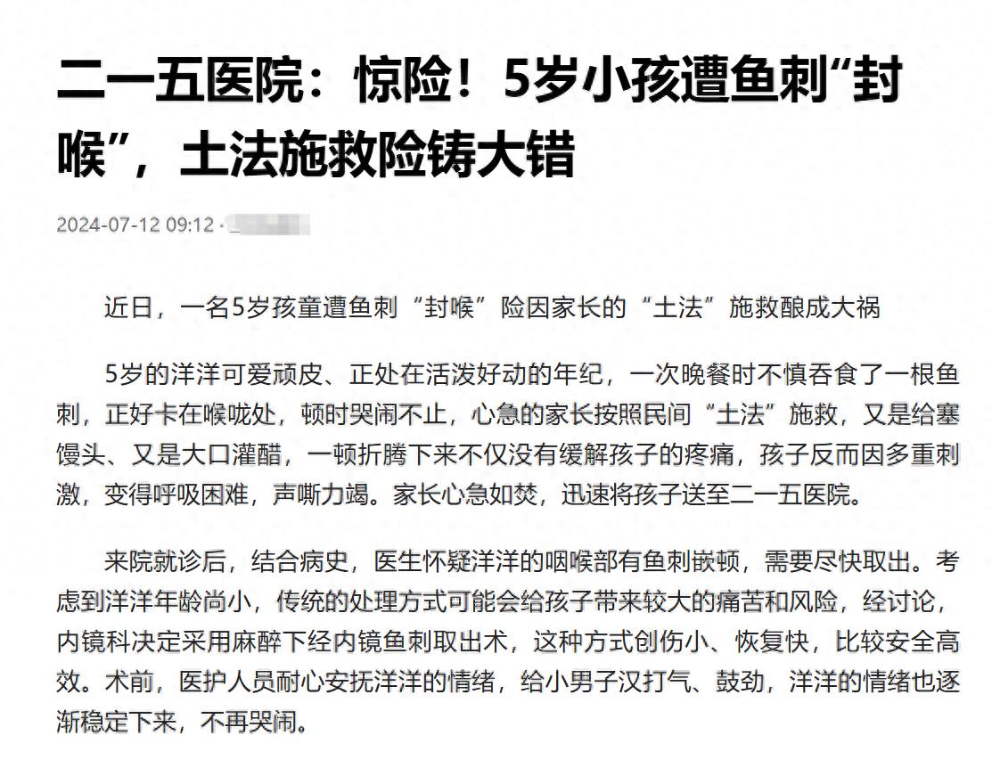前不久陝西有個5歲的小男孩洋洋,在喫魚的時候不小心吞進去了魚刺,心急的家長就按照民間的土辦法給孩子處理,讓孩子吞饅頭,然後大口的灌醋,結果一番折騰下來,孩子不僅僅沒有好轉,反而變得呼吸急促,哭得聲嘶力竭。