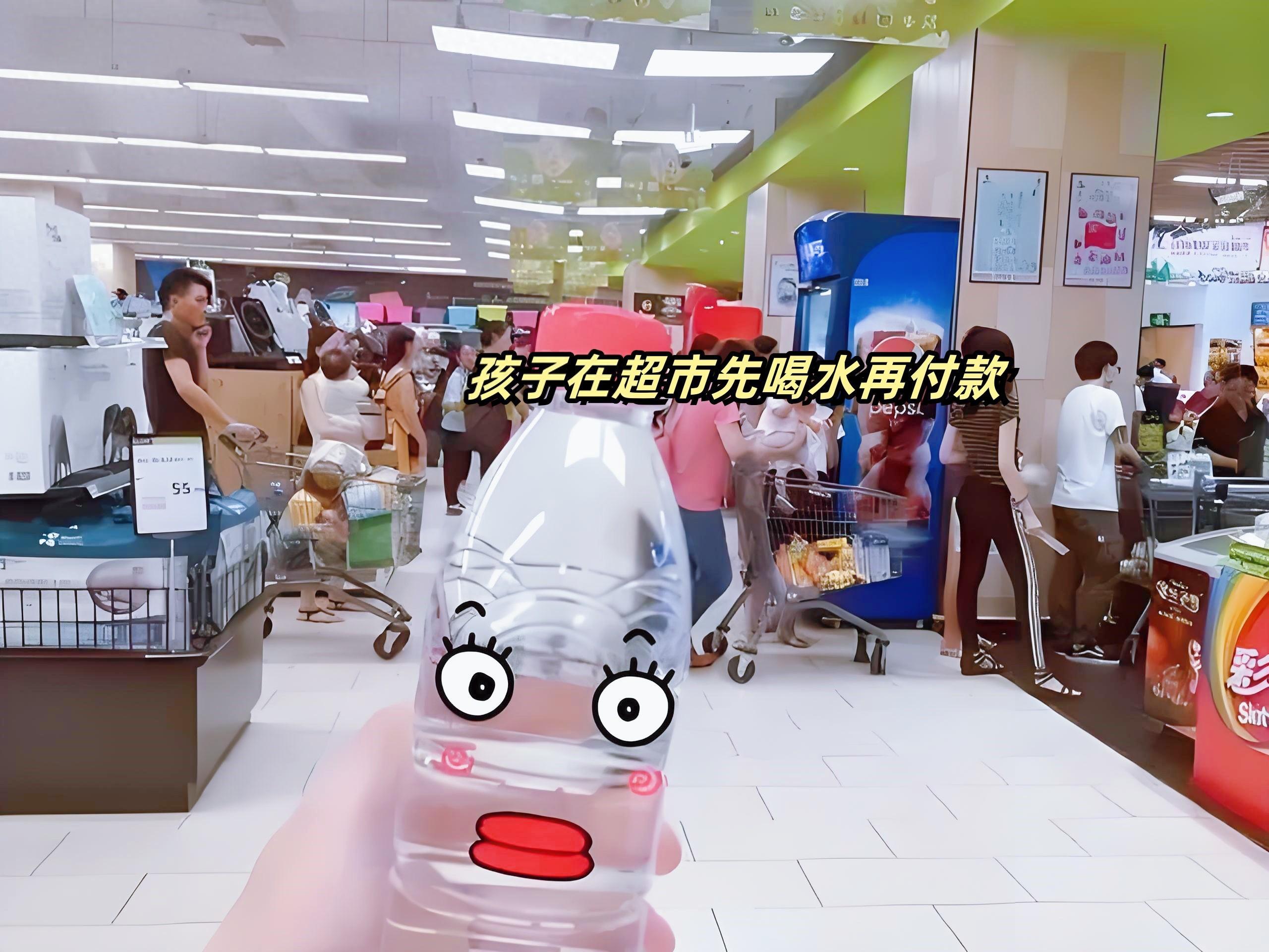 一位媽媽帶着自己的孩子逛超市,孩子口渴了,正好路過飲品區,他拿起一瓶礦泉水就打開了,迫不及待地喝了起來。