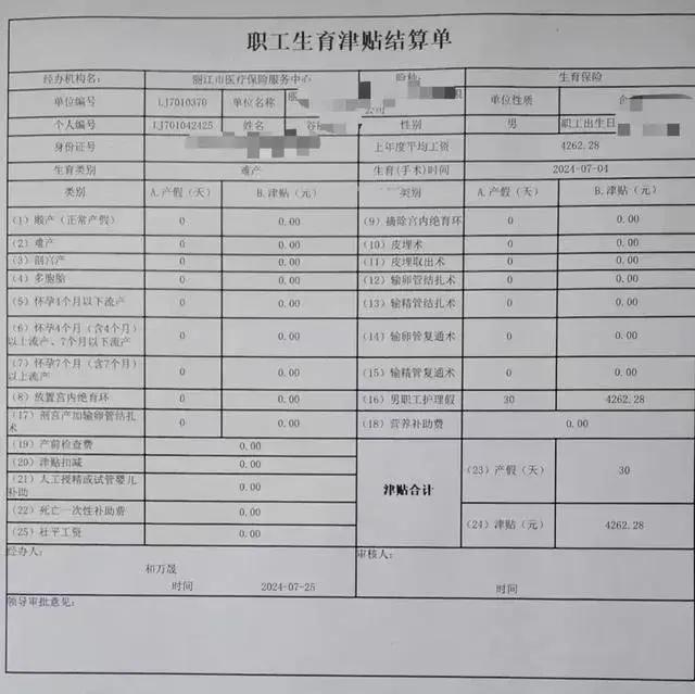 麗江市在2024年7月1日開始執行,在7月22日,一個男職工就在麗江醫療保障局領取了生育保險津貼報銷,領了4000多塊錢,大概跟工資差不多。