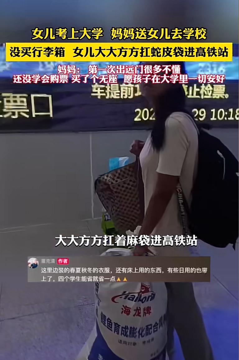 媽媽拍這個視頻的目的是想說自己的女兒考上了大學,但是底子裏面還是很淳樸的,而且很自信,拿着不漂亮卻很實用的不花錢的蛇皮袋進高鐵站,也大大方方地把蛇皮袋扛在肩膀上,讓媽媽覺得非常的欣慰,自己的女兒這麼懂事。