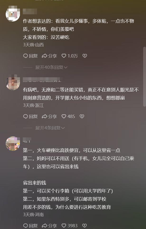 “扛蛇皮袋蹲高鐵上大學”火了,媽媽欣慰女兒懂事,網友:有病吧