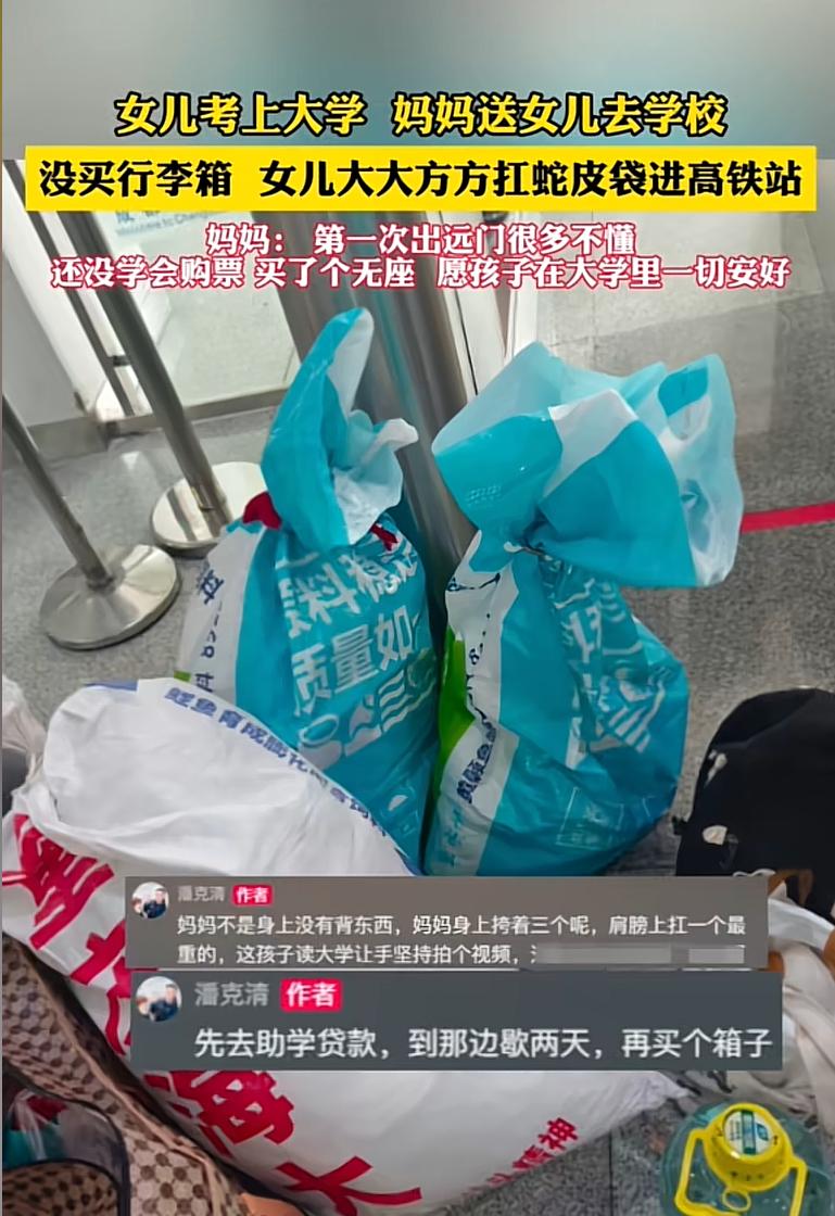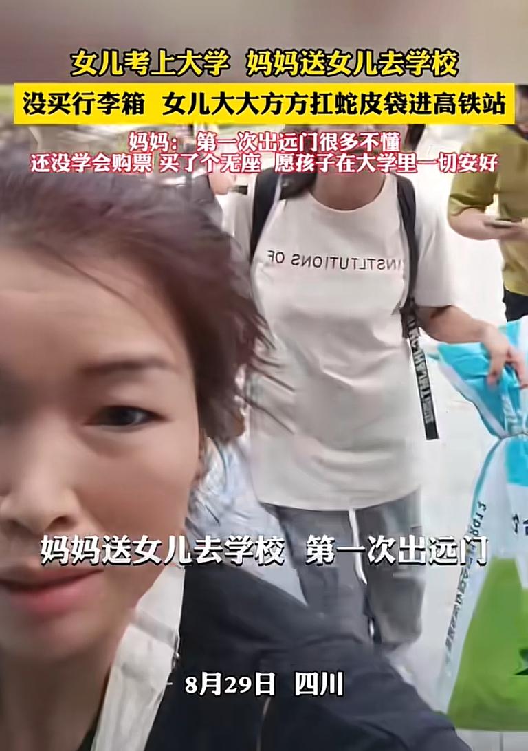 網上看到一個媽媽拍了一個跟女兒去上大學的短視頻,她說女兒考上了大學,自己送女兒去學校,沒有給女兒買行李箱,就用蛇皮袋裝着孩子的衣服以及被子。