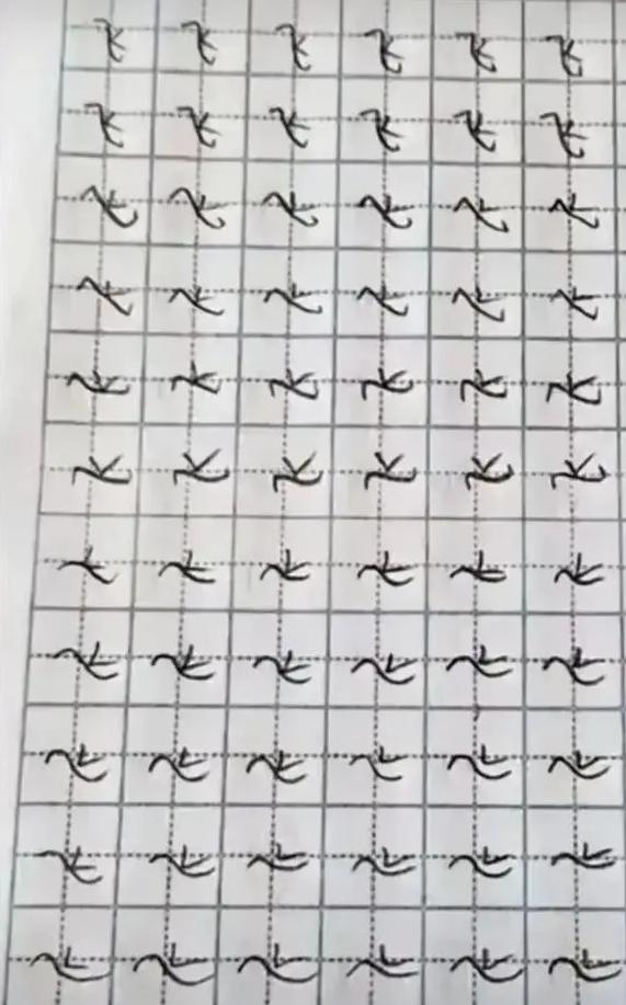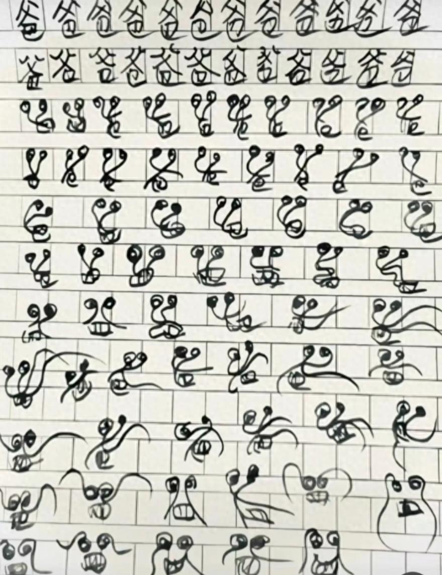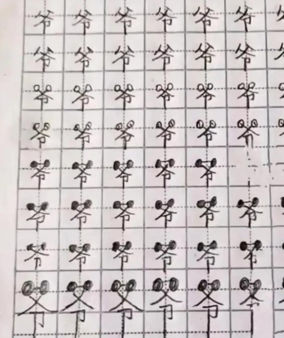 小學生們寫字確實樂趣很多。網上看到有一個孩子被罰寫爸爸的“爸”,前面還寫的像模像樣,後來都看不出是“爸”字,反而看到是一雙圓圓的大眼珠子,還有一個小肚子,都不知道是什麼東西。