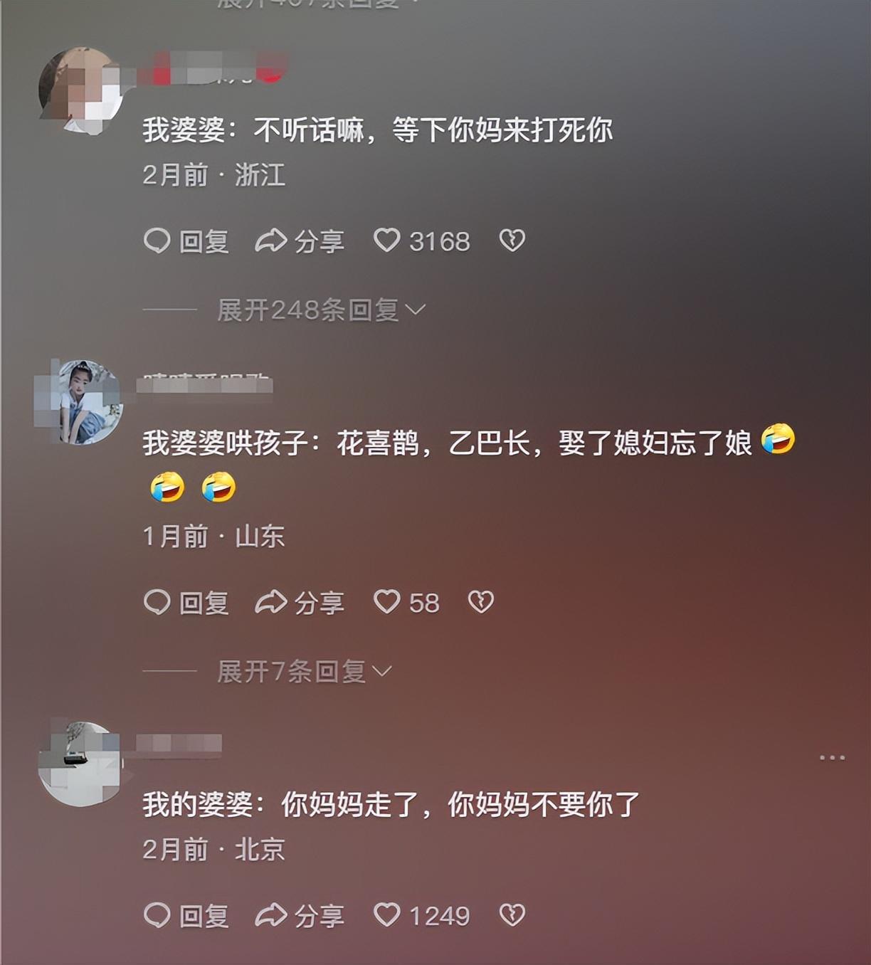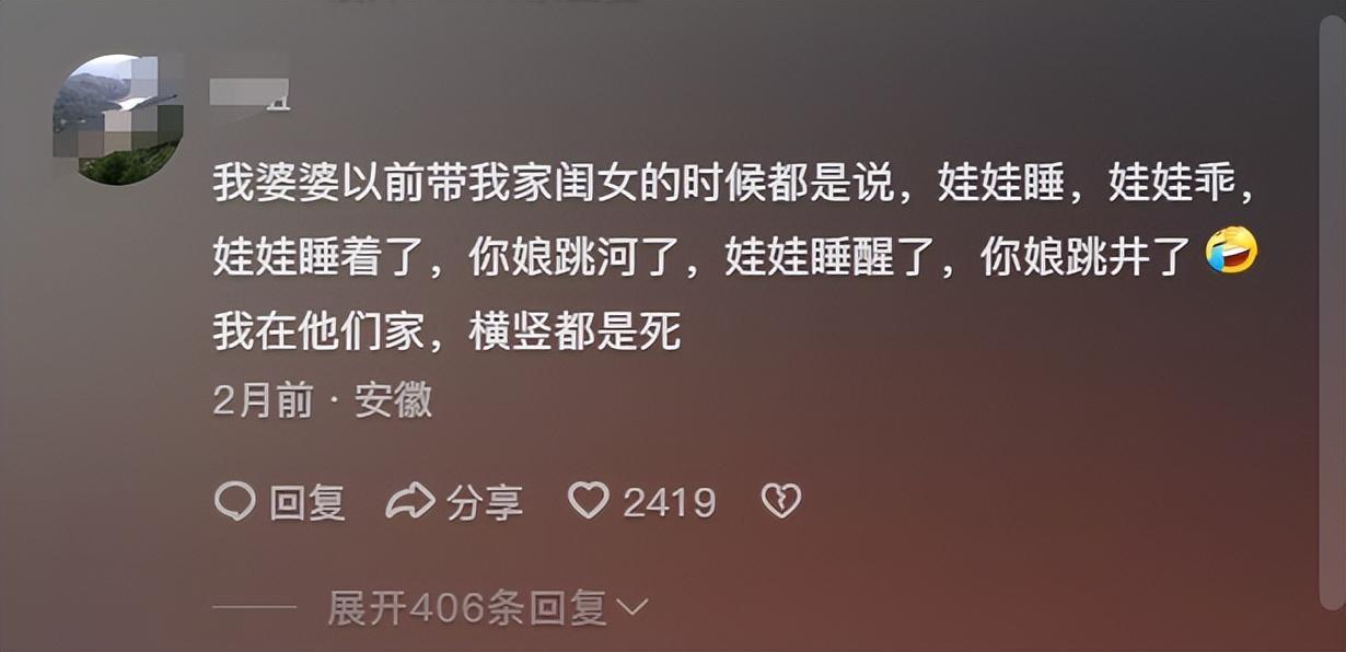 看到這個奶奶的視頻評論區裏面可以說是一堆羨慕,有媽媽更是說自己婆婆以前帶閨女的時候說:娃娃睡,娃娃乖乖,娃睡着了,你娘跳河了,娃娃睡醒了,你娘跳井了……