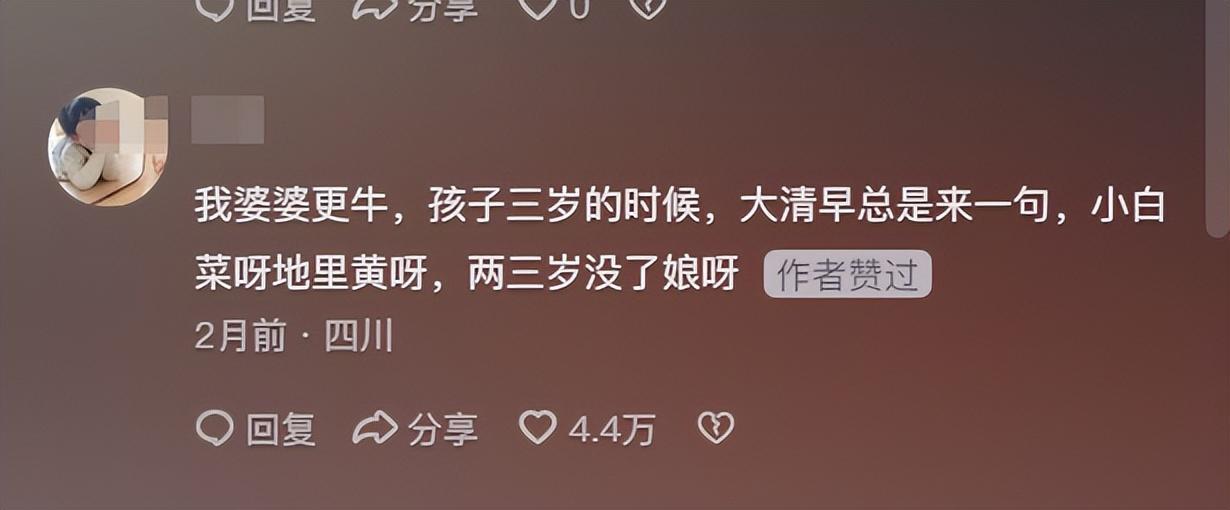還有網友說:孩子兩三歲的時候,大清早來一句,小白菜呀,地裏黃呀,兩三歲沒了娘呀
