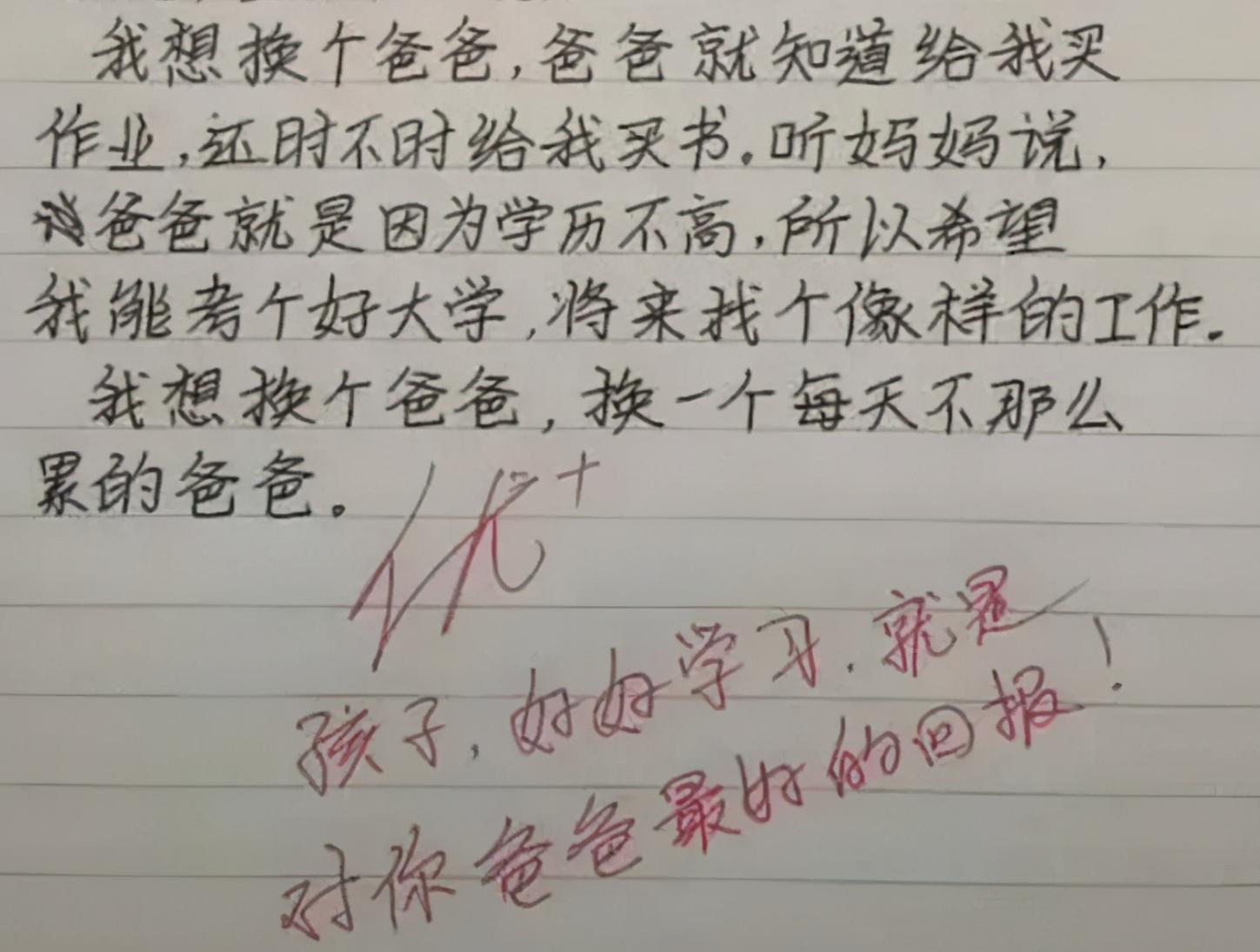 還看到一個老師曬出來的三年級孩子作文《我的爸爸》,孩子說爸爸就知道給我買作業給我買書,媽媽說爸爸因爲學歷不高,所以希望我能考個好大學,將來找個像樣的工作,孩子的願望就是換個爸爸。