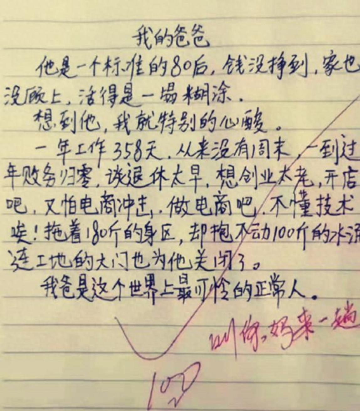 那這些人物的描寫中,其中我的爸爸是笑料和痛點最多的,一個小學生寫了一篇《我的爸爸》的作文,老師看到了又想哭又想笑,簡直就是同時戳中淚點和笑點,同時也對這個孩子的文采表示滿意,直接給了100分,在100分之後還在上面寫上評語“叫你媽來一趟”。