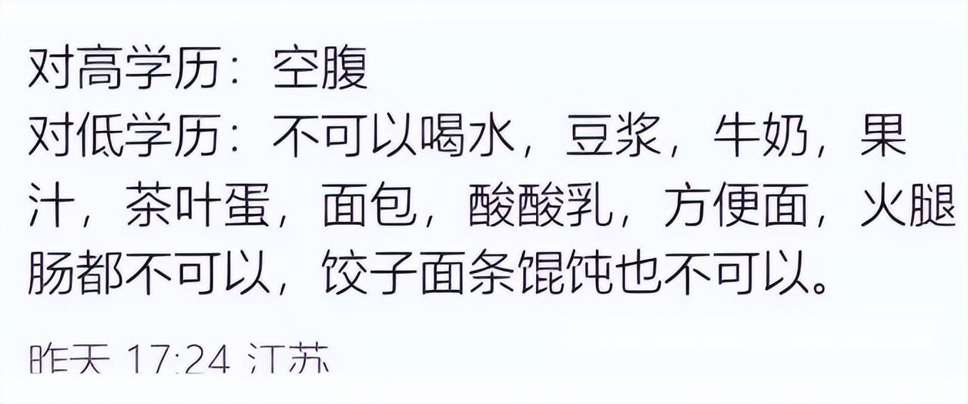 而對於低學歷的人來說,醫生就要詳細的告知,不能喝水、豆漿、牛奶、果汁;不能喫雞蛋、麪包、方便麪、火腿腸都不可以,麪條餛飩更是不可以。