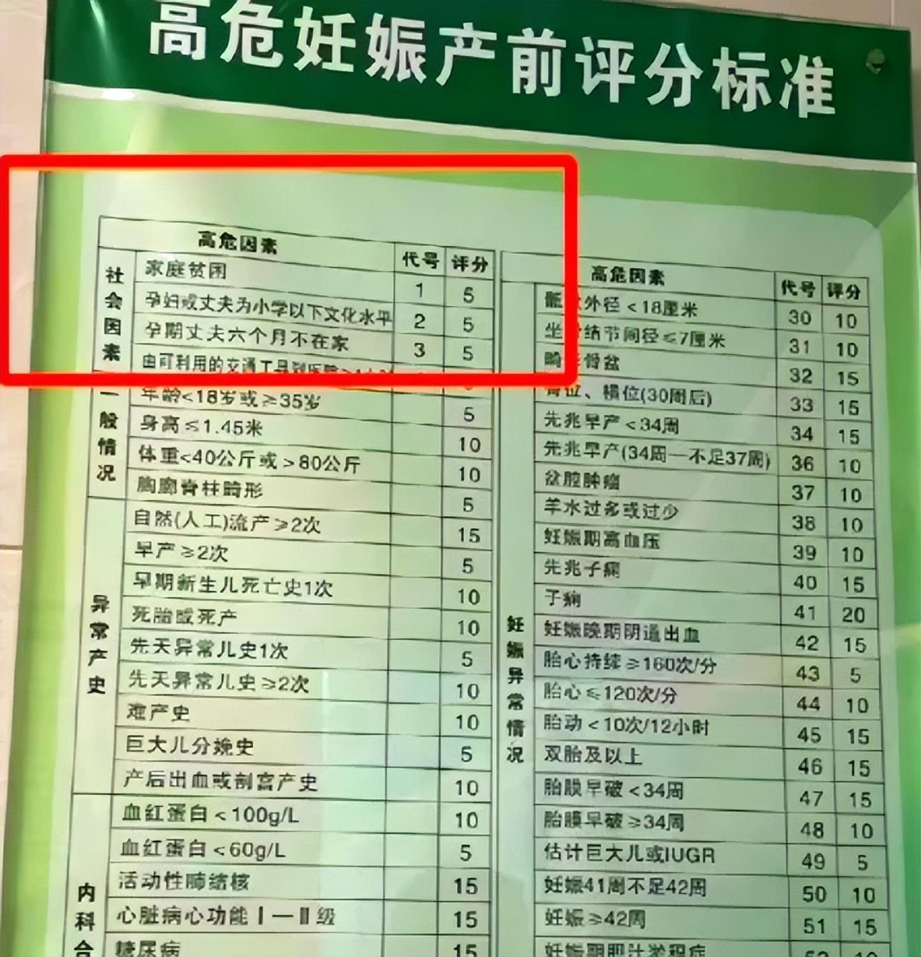 在她的視頻中,的確看到了醫院判定高危妊娠的產前評分標準中,第二條就是:孕婦或丈夫爲小學以下文化水平。