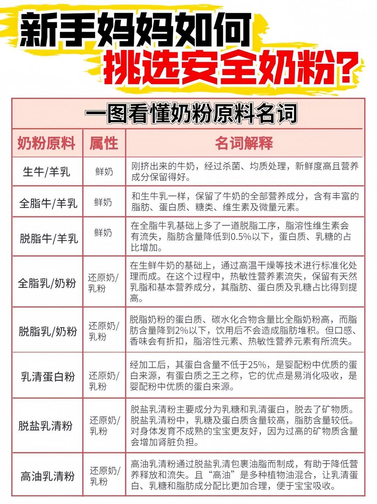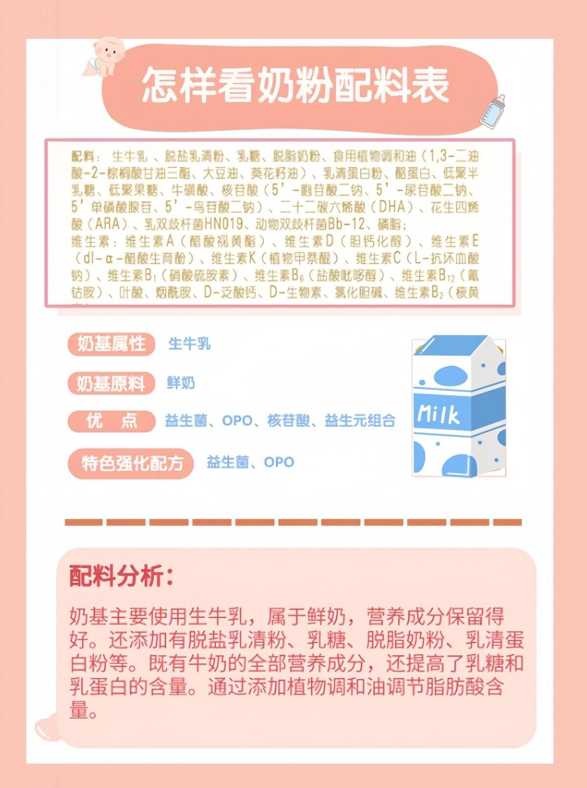 ①奶基原料:奶基原料是奶粉的基礎,也是蛋白質的主要來源。如果奶粉的基底是“生牛乳”、“鮮牛奶”、“脫脂牛奶”或“全脂牛奶”,那這些奶粉的原料通常更新鮮。
