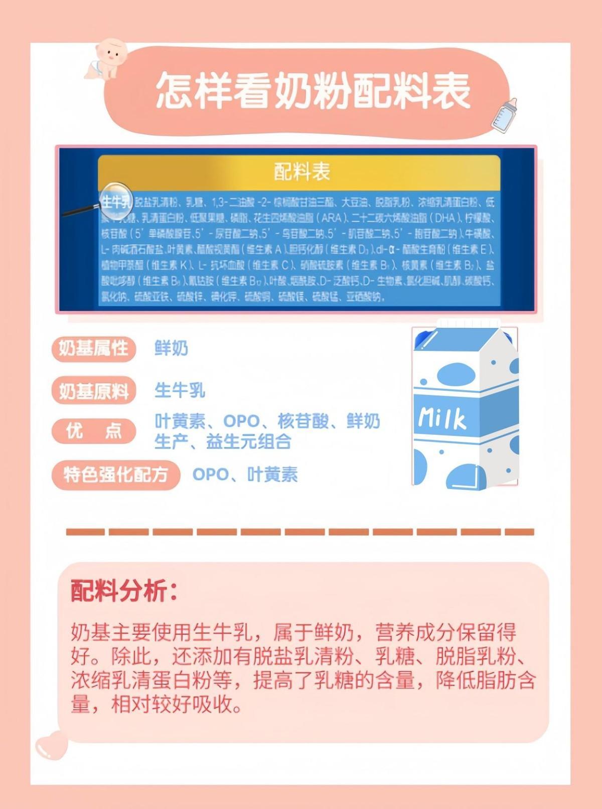 比如有“生牛乳”這一成分的就表明奶粉的原材料是新鮮的牛奶,且越排在配料表前面的位置,說明其含量越高、品質越好,可以放心購買。