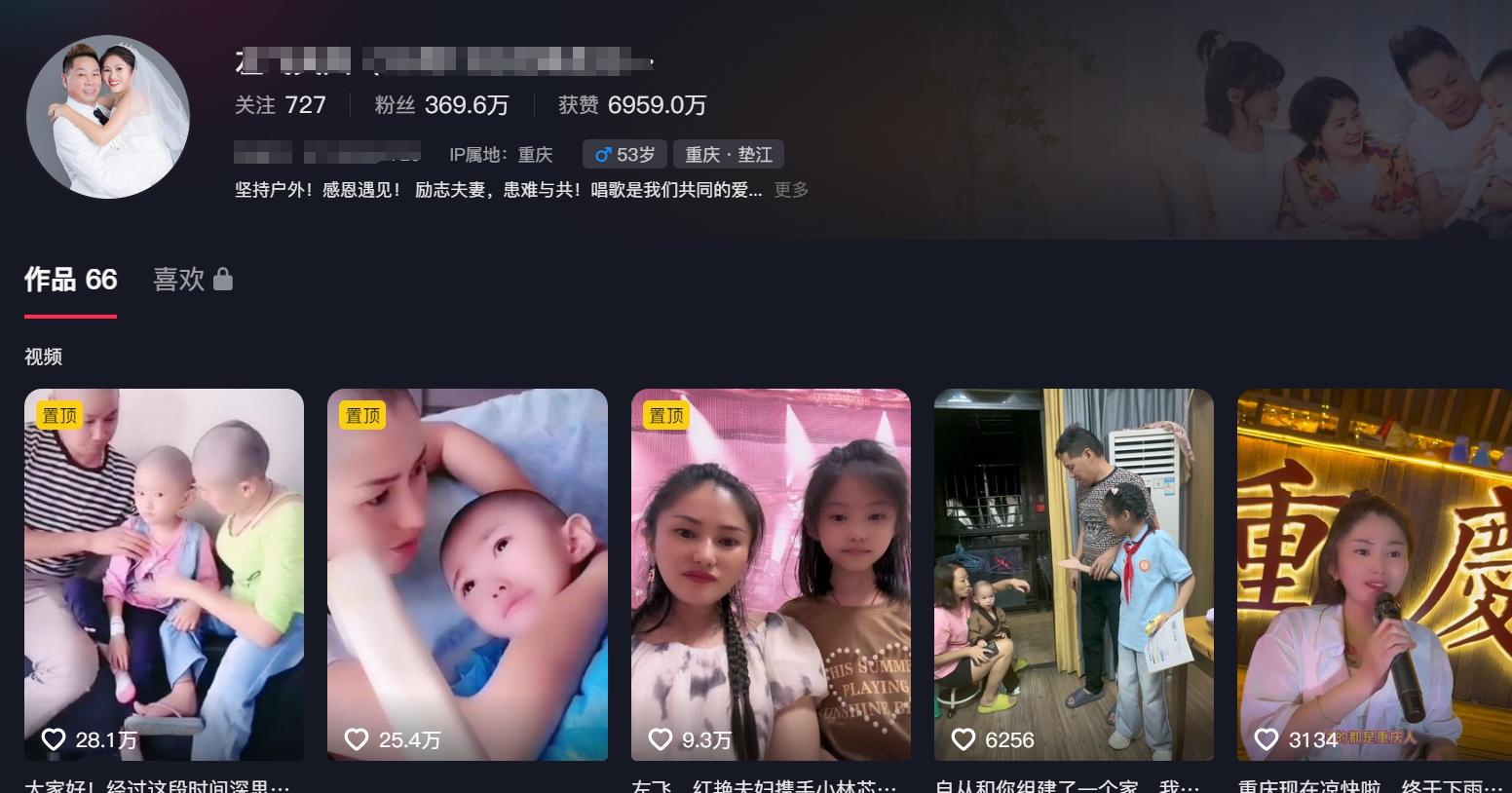 女兒慢慢的長大兩夫妻的生活越來越好,因爲碰上了互聯網時代,他們就在網上直播賣唱,在網上發的小視頻,兩夫妻的賬號都有幾百萬的粉絲,每一個視頻發出來都有上10萬以上的點贊,估計閱讀量都能上百萬。