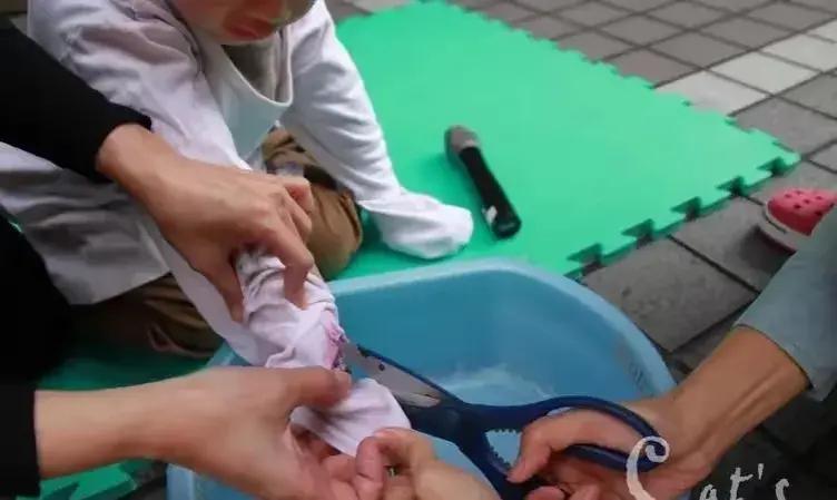 但是如果孩子燙傷的比較嚴重的話,衣服可能會黏在傷口上面,媽媽就不要強硬地把這個衣服給撕下來,就可以把旁邊的褲子剪掉,儘可能的讓傷口裸露出來。