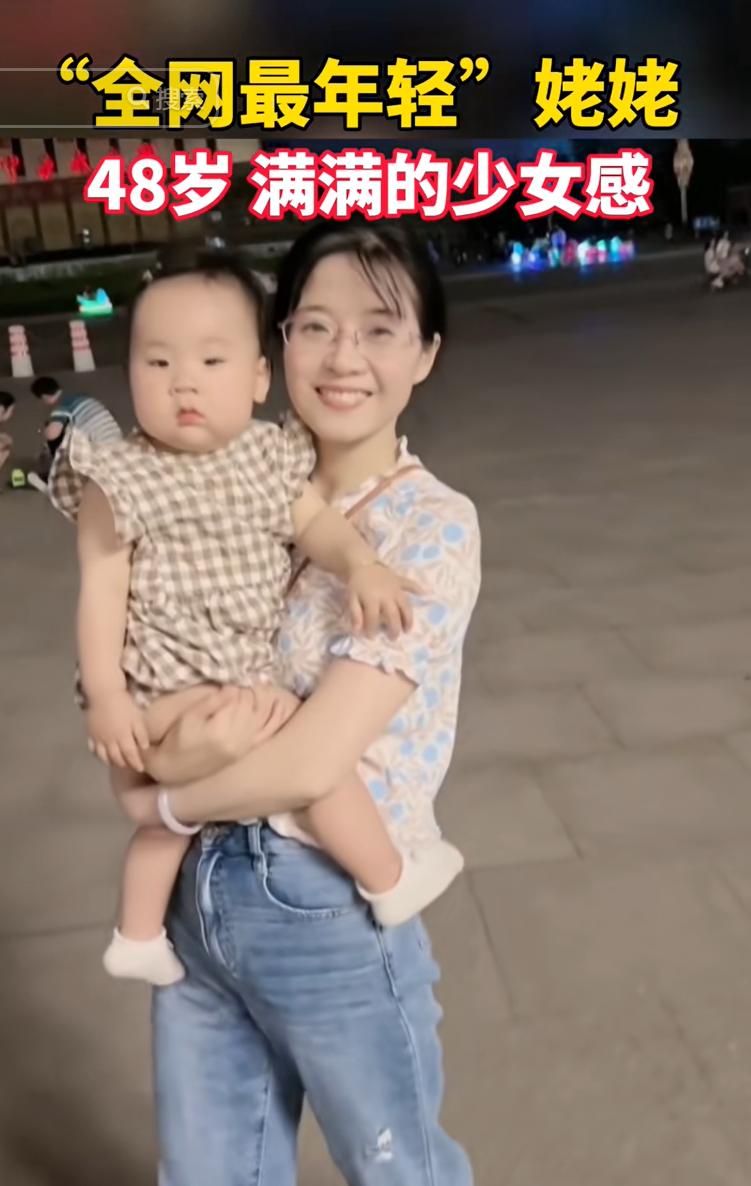 這個姥姥已經48歲了,但是身上真的是滿滿的少女感,姥姥的皮膚很白,看得出來臉上沒有醫美的痕跡,是原裝的,但是姥姥臉上沒有什麼皺紋,戴着一副眼鏡看起來非常斯文,而且頭髮也是非常的烏黑,身材不胖不瘦,穿着一條牛仔褲和碎花上衣,抱着自己胖嘟嘟的外孫女。