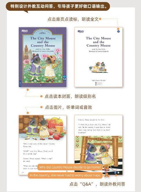 此外,這套書也支持點讀,可以朗讀封面、全文和圖片,能隨時隨地地讓孩子磨耳朵;而且還特別設計了外教互動問答,能引導孩子更好地做口語輸出。