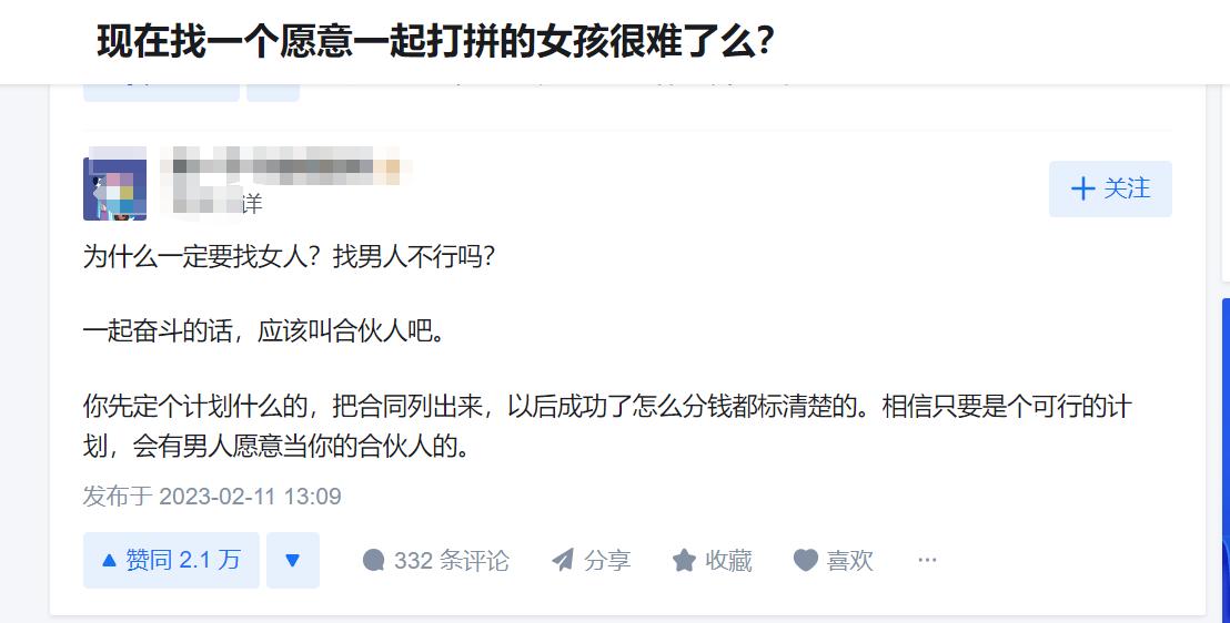 這讓我想起在網上看過的一個熱門提問:現在找一個願意一起打拼的女孩子很難了嗎?有一個高讚的回答是:爲什麼一定要找女人呢?找男人不行嗎?一起奮鬥的話應該叫合夥人吧!