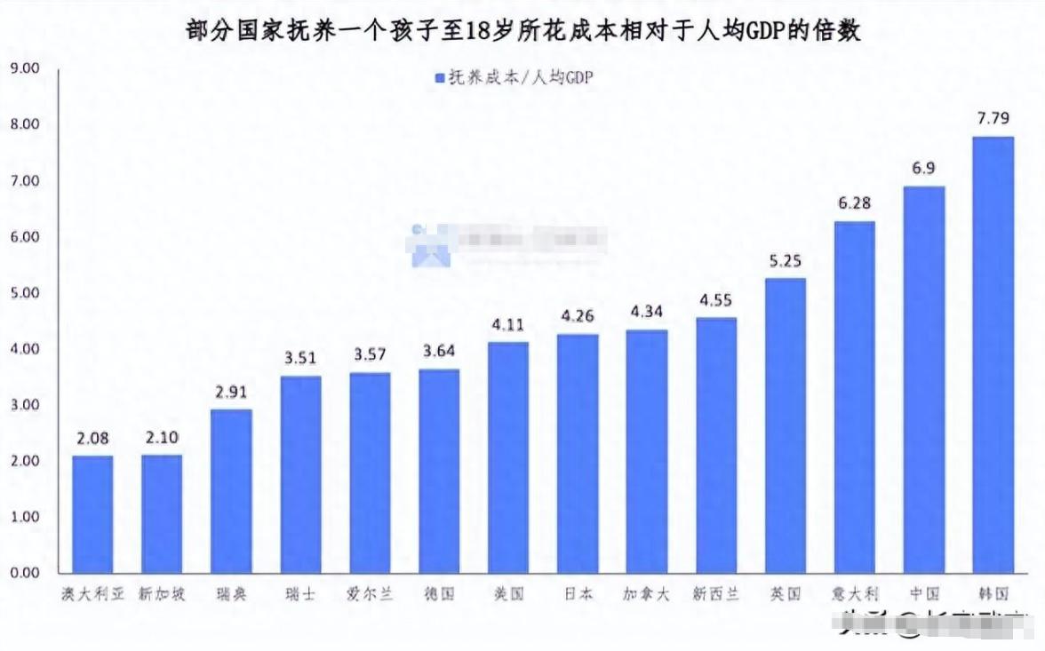 澳大利亞這樣一個發達國家,養育一個孩子0~18歲花費的成本是人均GDP的2.08倍,排在第1個少的,第2個少的是新加坡是2.10倍,最多的是韓國7.79倍,倒數第二的是中國6.9倍。
