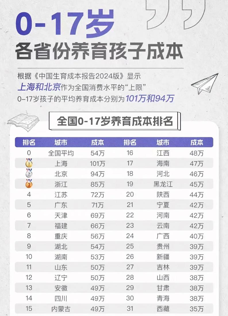 而另外一組調查數據是根據國內不同省份,0~17歲養育成本進行統計,上海養育成本是最高的,養育孩子到成年需要100多萬,北京也要將近100萬,浙江是80多萬,而最少的是西藏35萬。