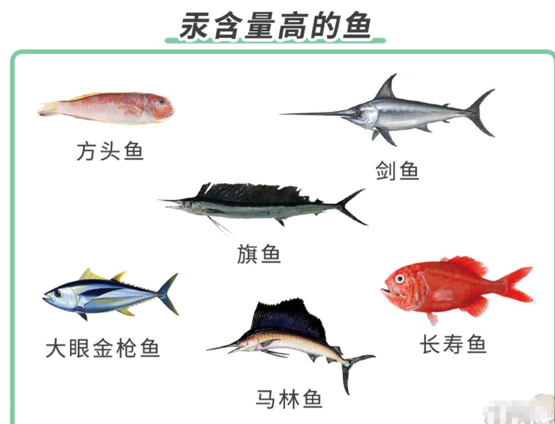 美國FDA聯合EPA曾經發布過魚類消費的“黑名單”,就是這些魚裏面含有的汞含量非常的高,主要是有8種,大眼金槍魚,方頭魚,鯊魚,長壽魚,劍魚,旗魚,大鯖魚,馬林魚。