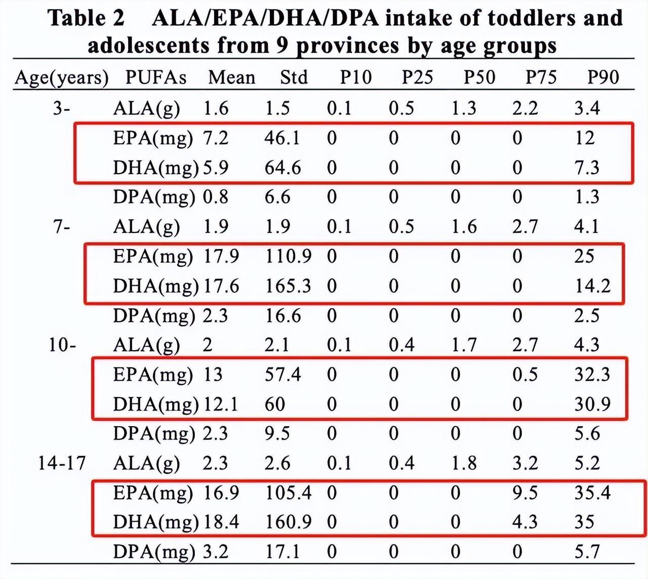 中國居民健康與營養調查,基於我國9個省3-17歲兒童青少年做過一項長期調查,結果顯示:我國大多數兒童青少年的DHA攝入水平度很低,只有10%-15%的攝入水平相對較高。